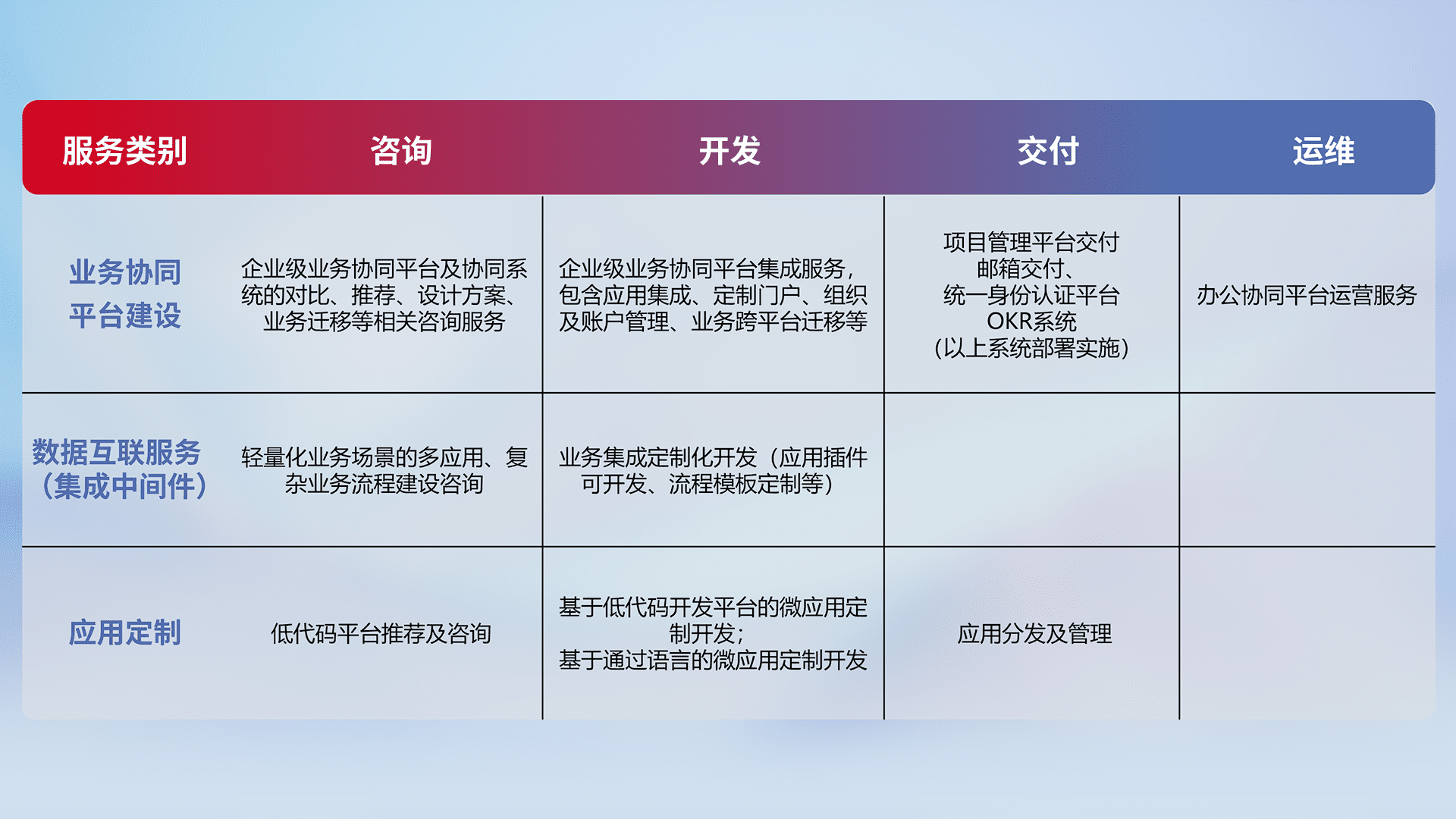 针对钉钉、、、企微、、、、IDaas等平台级产品提供产品的规划、、、方案、、交付、、、定制化开发等服务,,实现如统一协同办公、、智能客户服务、、、、混合会议管理、、、智能数据查询、、、等业务场景,,,,实现数字化转型。。。。